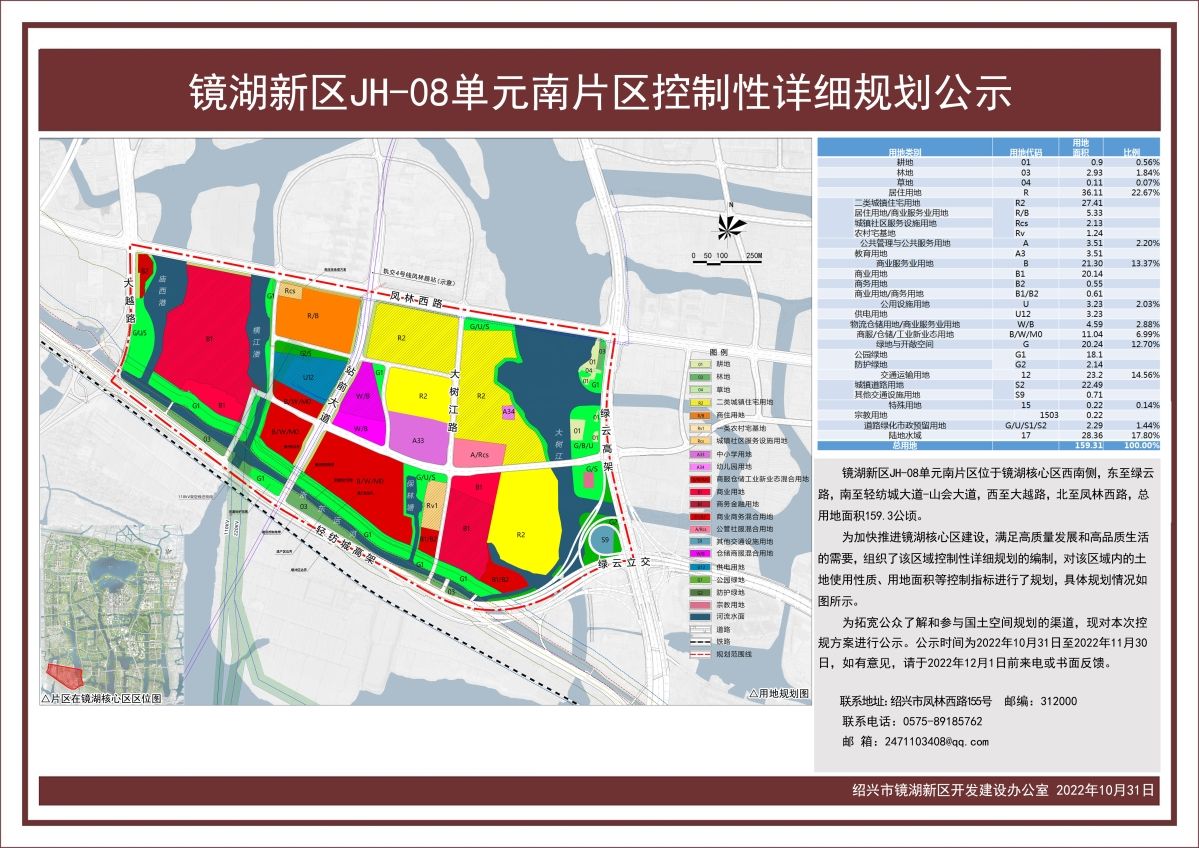 近日,绍兴市自然资源和规划局网站发布了《镜湖新区JH-08单元南片区控制性详细规划公示》,该片区位于镜湖核心区西南侧,东至绿云路,南至轻纺城大道-山会大道,西至大越路,北至凤林西路,总用地面积159.3公顷(2389.5 亩)。具体规划如图